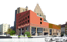 Koncepcja zabudowy rynku w Nysie. Projekt przewiduje mix funkcjonalny czyli funkcję usługową w parterze budynku, biura na 1 piętrze oraz mieszkania na kolejnych kondygnacjach.